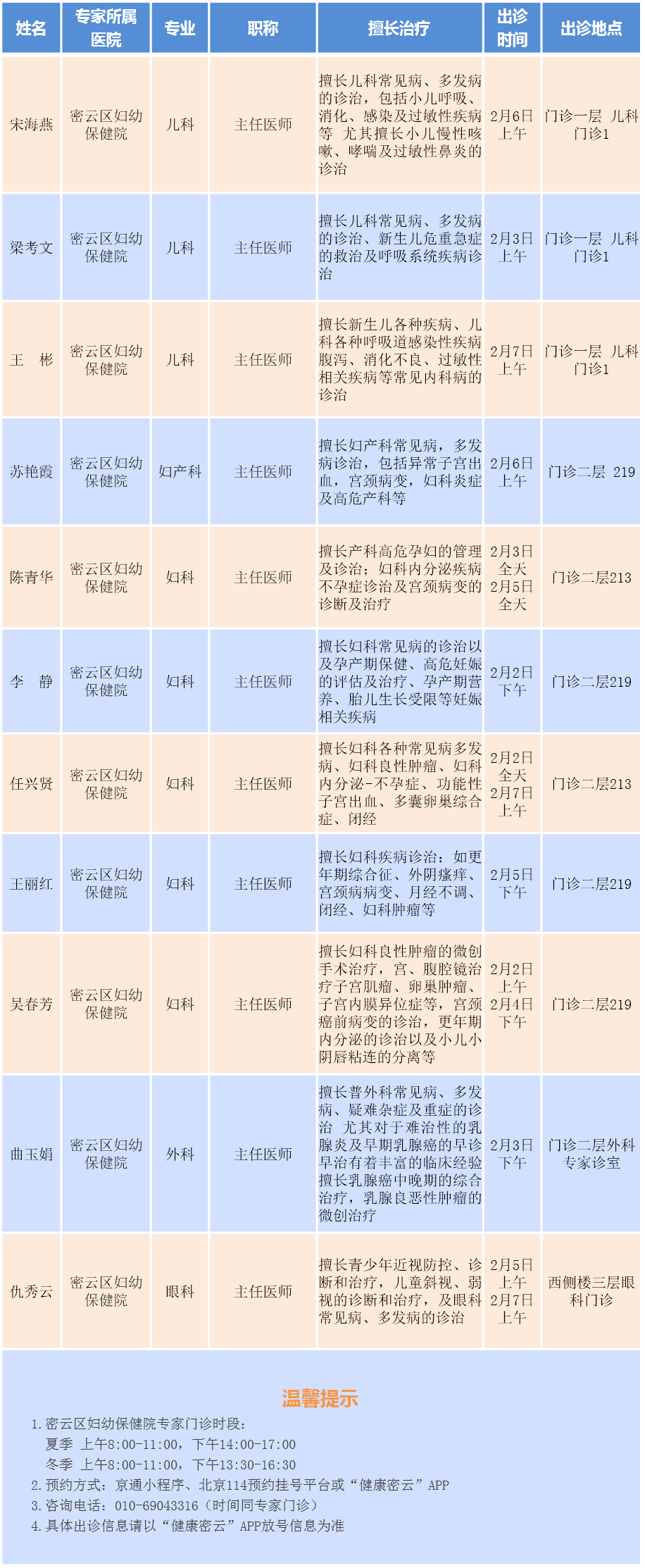北京市密云区妇幼保健院专家门诊安排(2026.2.2-2.8)