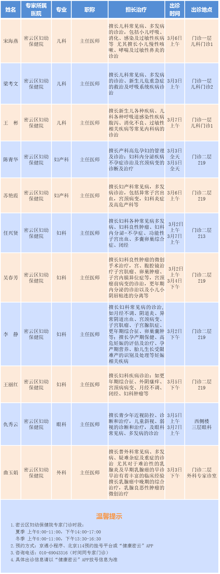 北京市密云区妇幼保健院专家门诊安排(2026.3.2-2026.3.8)