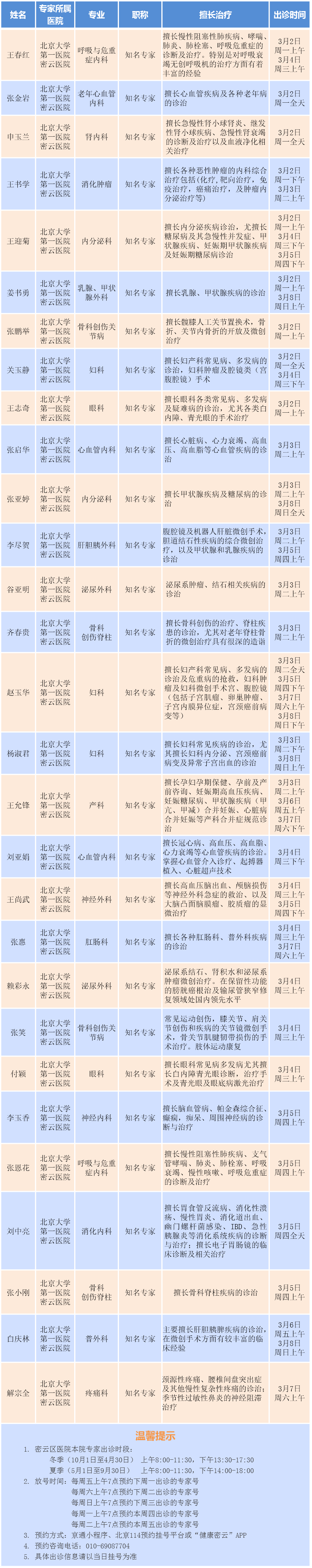北京大学第一医院专家密云医院出诊安排(2026.3.2-2026.3.8)