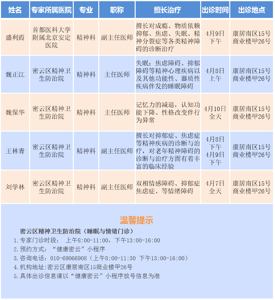 北京市密云区精神卫生防治院专家门诊安排(2026.4.6-2026.4.12)