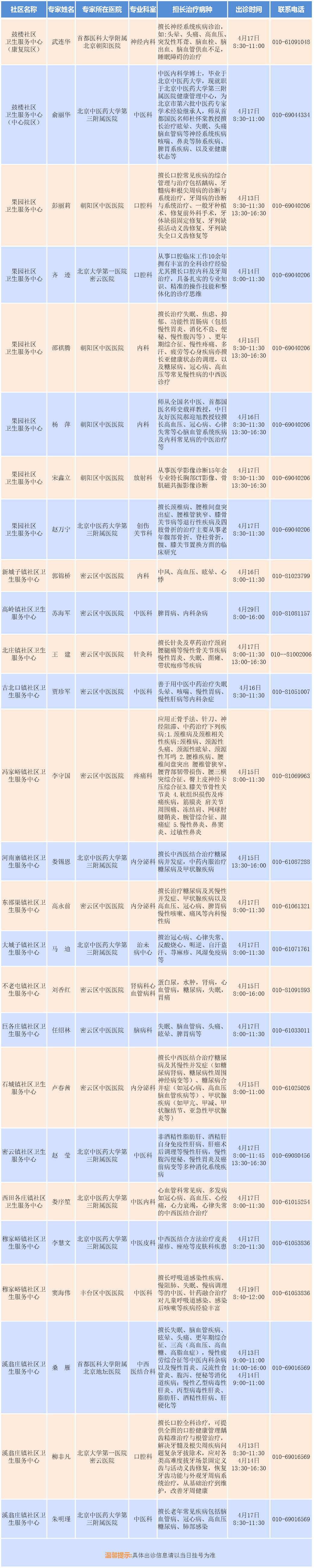 专家支援社区出诊安排(2026.4.13-2026.4.19)