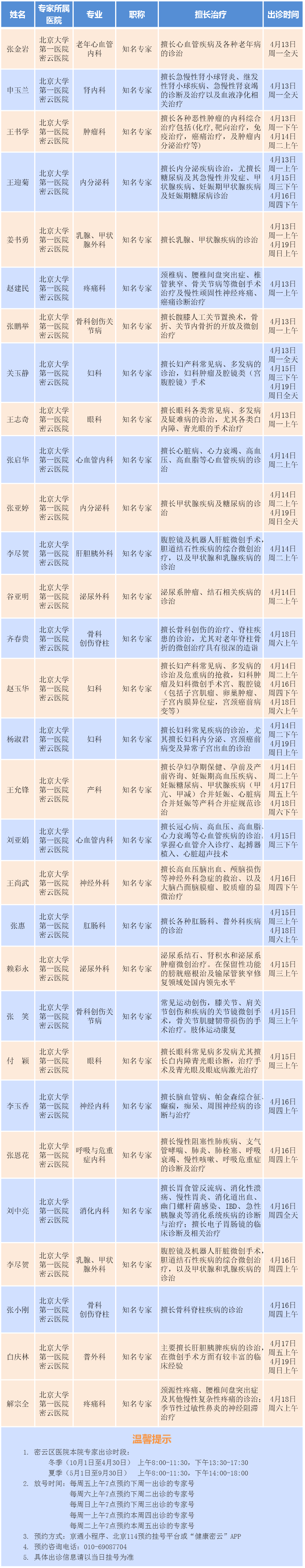 北京大学第一医院专家密云医院出诊安排(2026.4.13-2026.4.19)