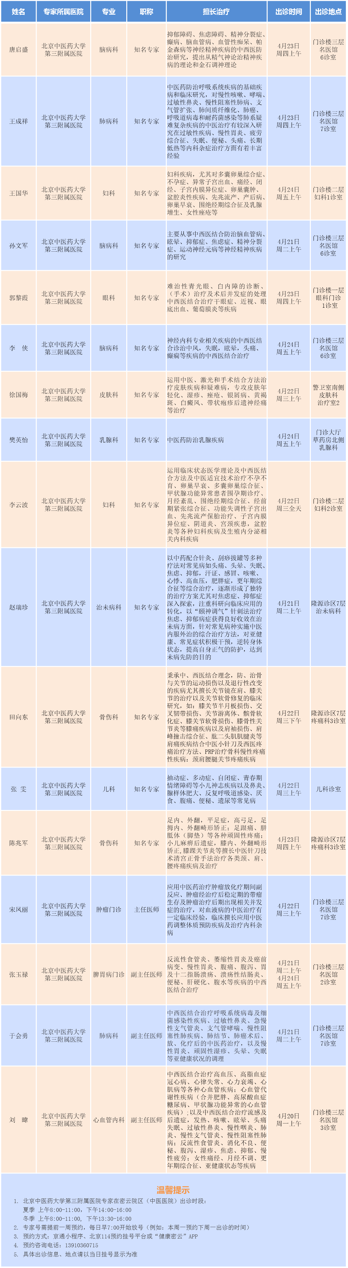北京中医药大学第三附属医院专家密云院区出诊安排(2026.4.20-2026.4.26)