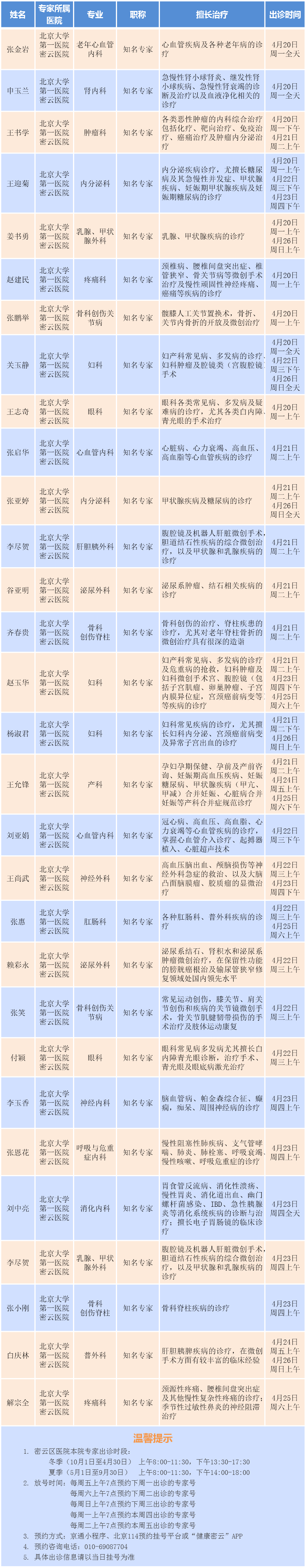 北京大学第一医院专家密云医院出诊安排(2026.4.20-2026.4.26)
