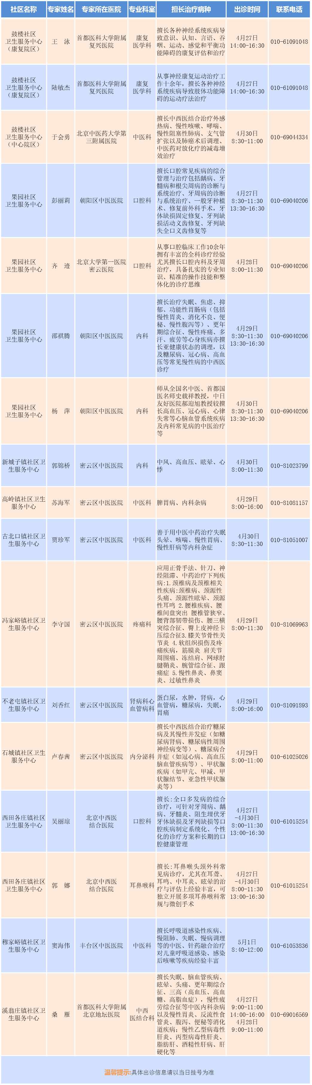 专家支援社区出诊安排(2026.4.27-2026.5.3)