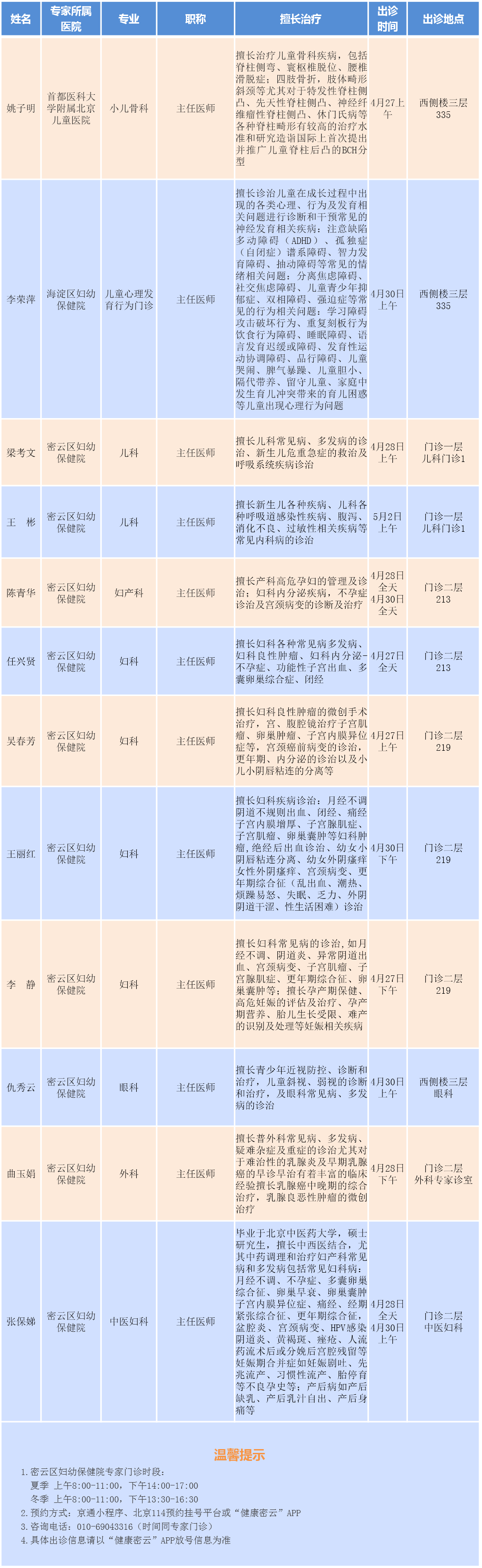 北京市密云区妇幼保健院专家门诊安排(2026.4.27-2026.5.3)