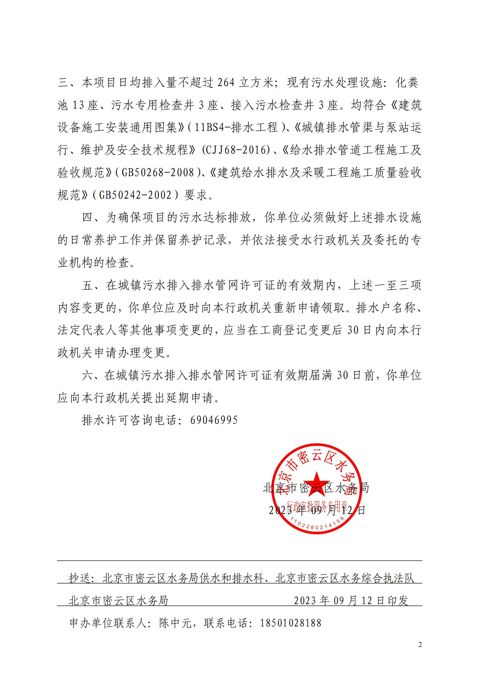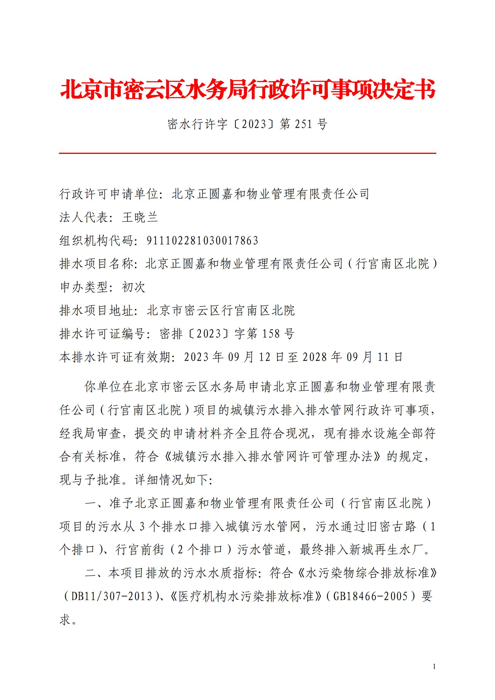 密水行许字〔2023〕251号 关于核发北京正圆嘉和物业管理有限责任公司(行宫南区北院)城镇污水排入排水管网许可的行政许可决定