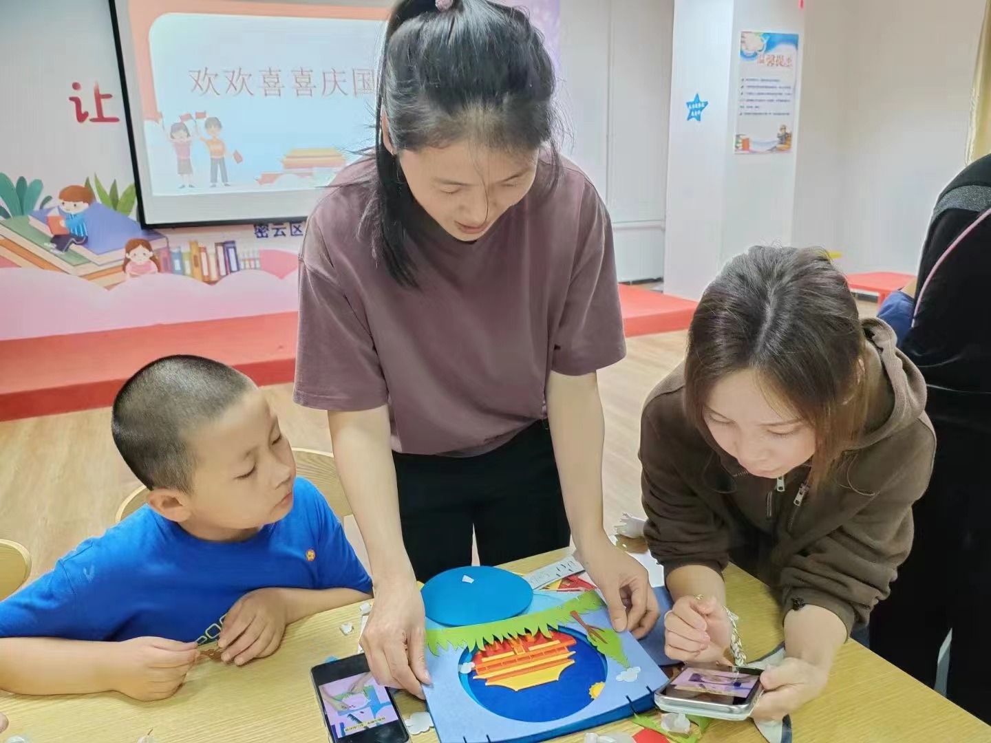活动最后结合国庆节主题,小读者们与家长共同制作手工艺品,提升其快乐感和自豪感,锻炼动手能力。