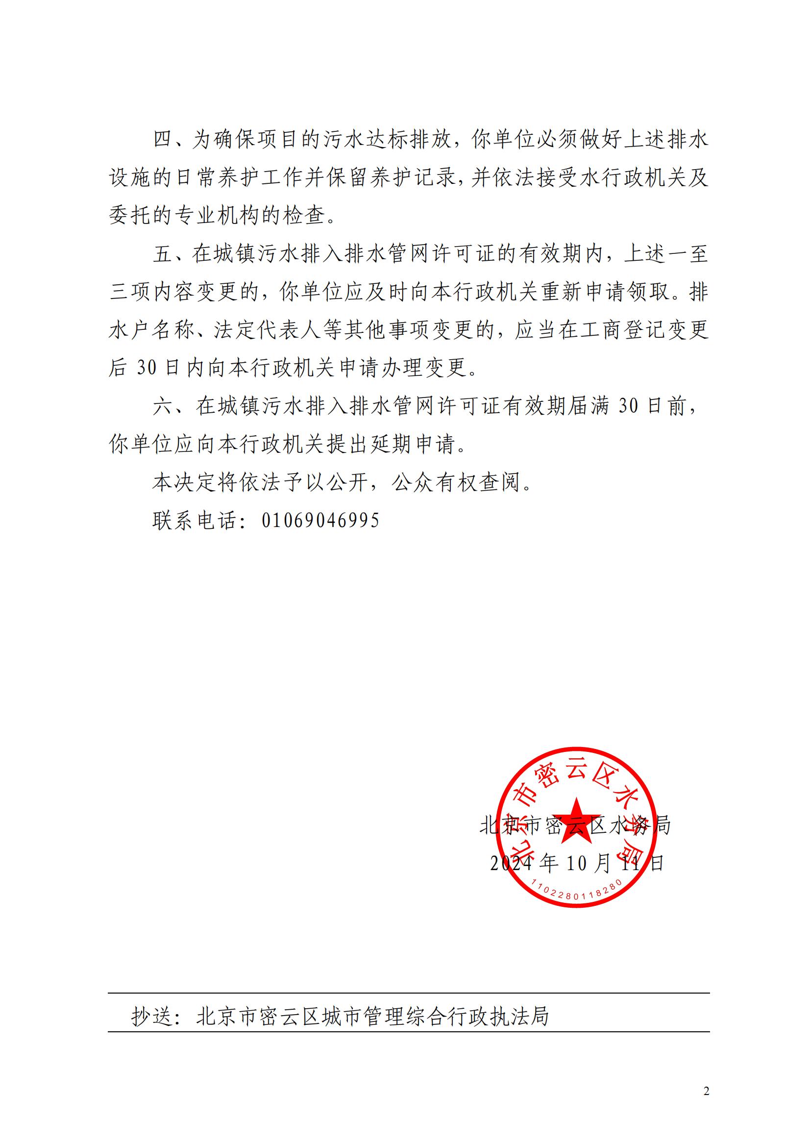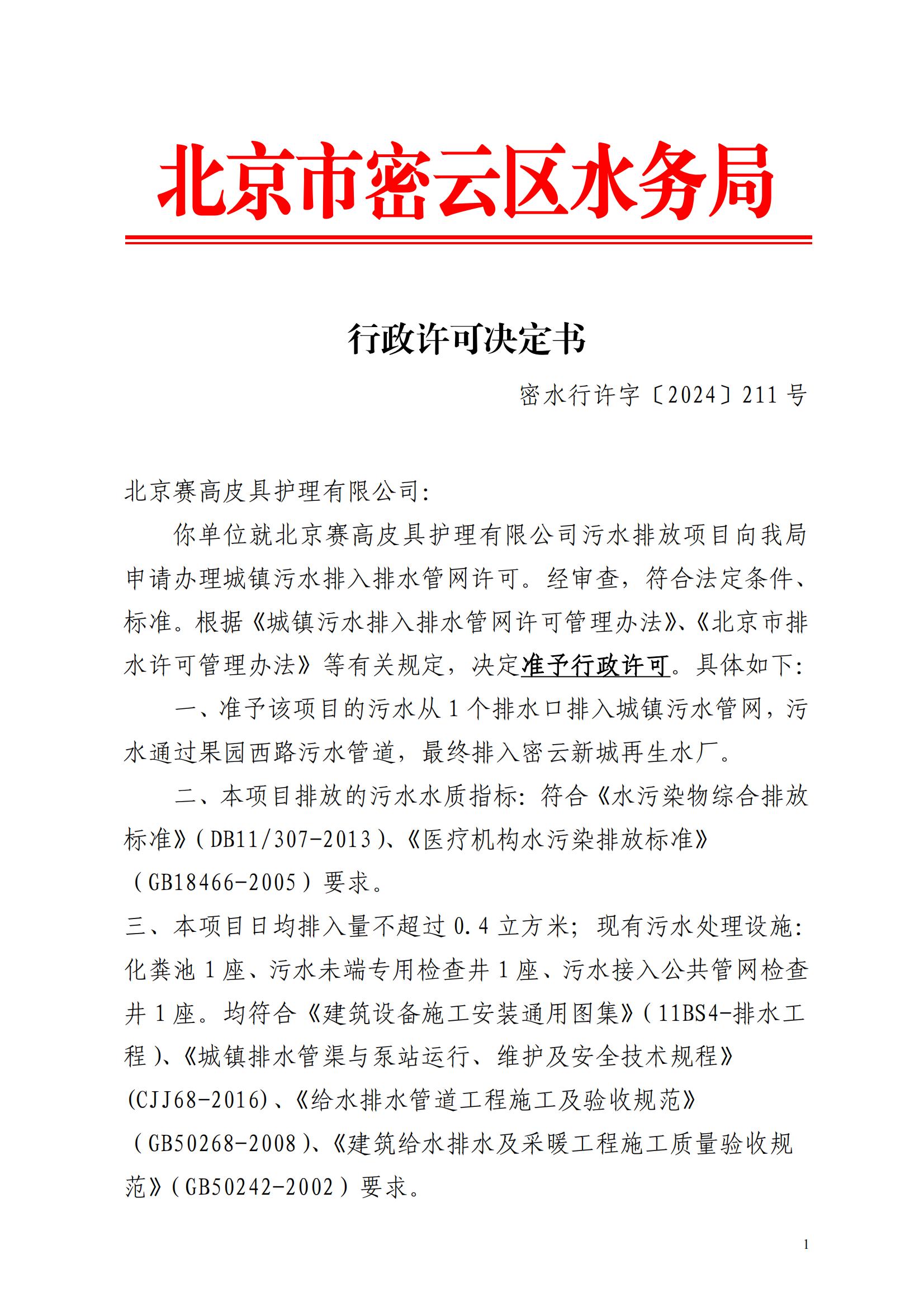 密水行许字〔2024〕211号 关于核发北京赛高皮具护理有限公司城镇污水排入排水管网许可的行政许可决定