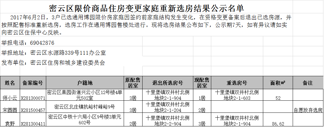 密云区限价商品住房变更家庭重新选房结果公示名单