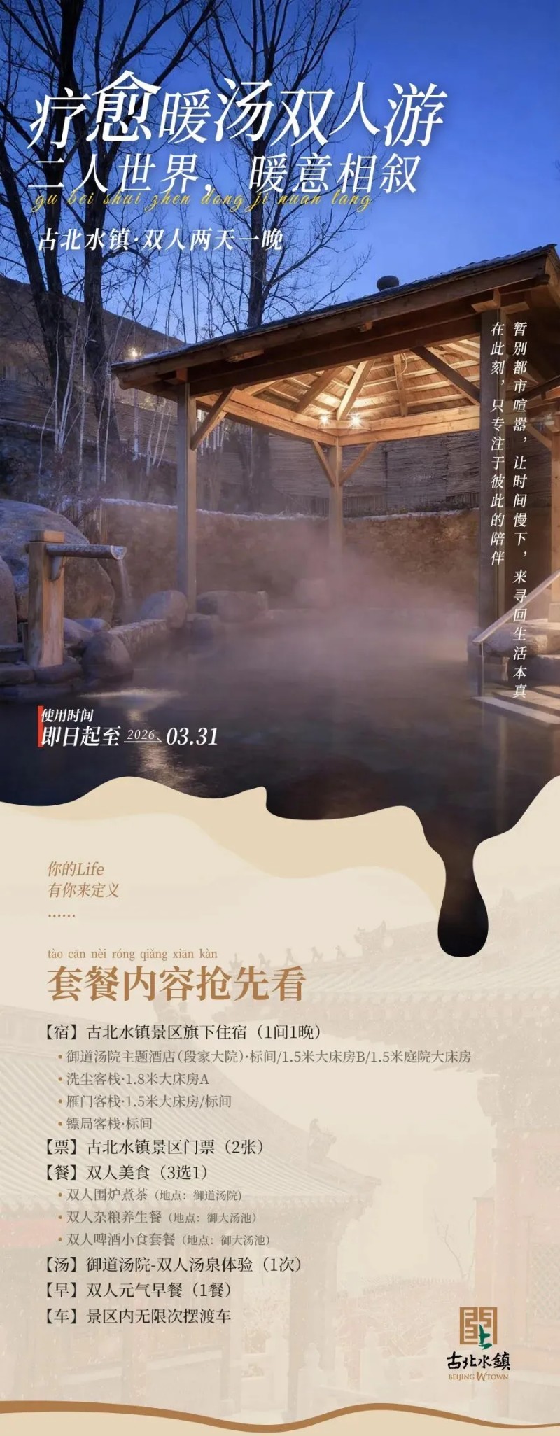 当新年的风掠过司马台长城的山脊,古北水镇便沉入一场温润的冬梦。青瓦覆素,石桥凝霜,千盏灯影在河面轻轻摇晃,把年节的暖意酿进每一寸巷陌。此时,最宜寻一处暖汤,让氤氲热气缓缓漫过肩颈洗去旧岁尘霜,也熨平心底褶皱。