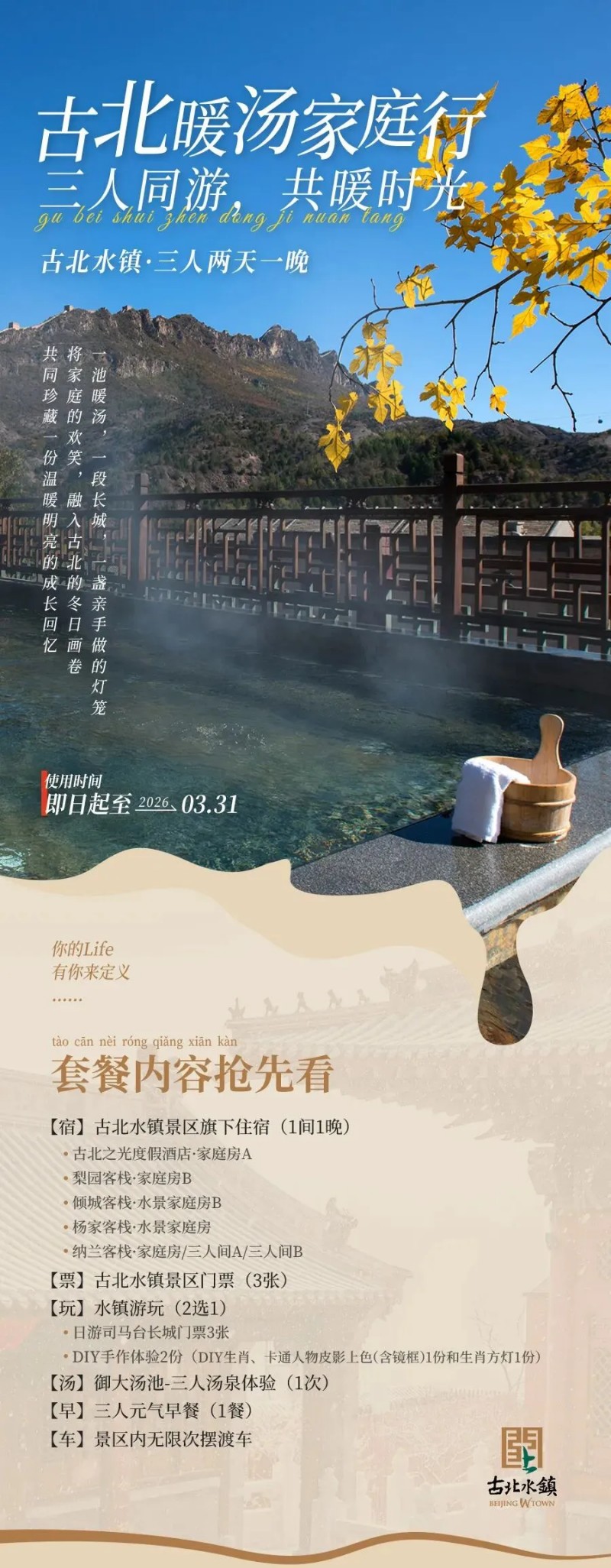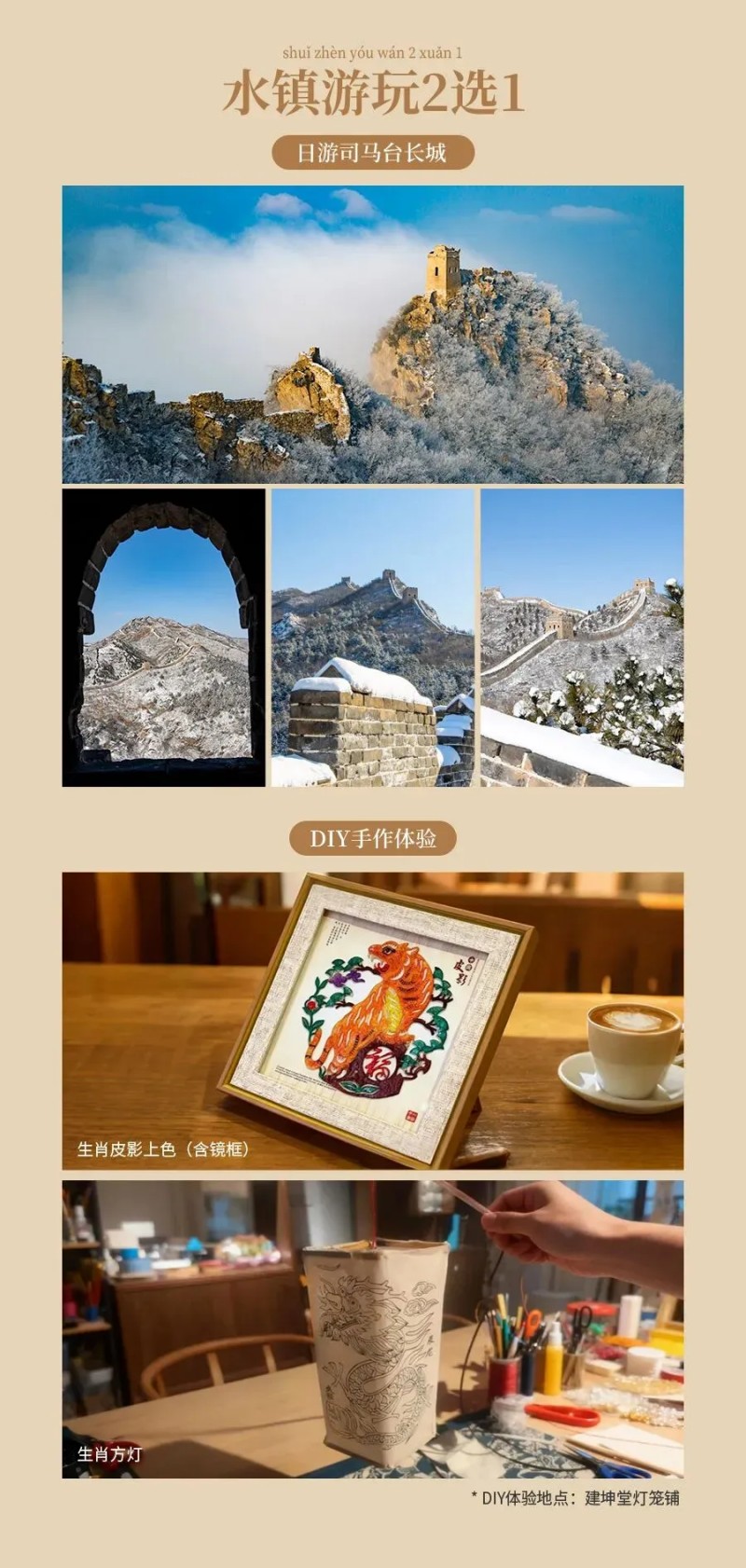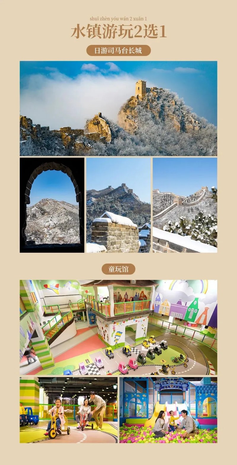 白天牵手登上司马台长城,或在童玩馆里尽情嬉戏;傍晚围坐享用热气腾腾的团圆暖锅,夜里还能泡着暖汤看星空。让全家在长城下的童话小镇共度温暖时光。这段旅程,既有长城下的壮阔,也有小镇里的欢笑,只为收藏你们共同的笑脸与回忆。