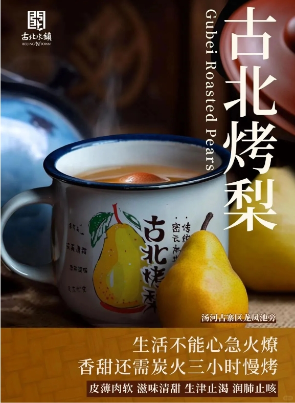 古北烤梨:选用新鲜雪梨去核,梨肉软烂多汁,喝口汤暖到胃里。