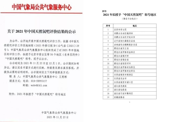 近日,中国气象局公共气象服务中心对2021年度56个“中国天然氧吧”地区进行公示,北京仅一家,密云榜上有名。