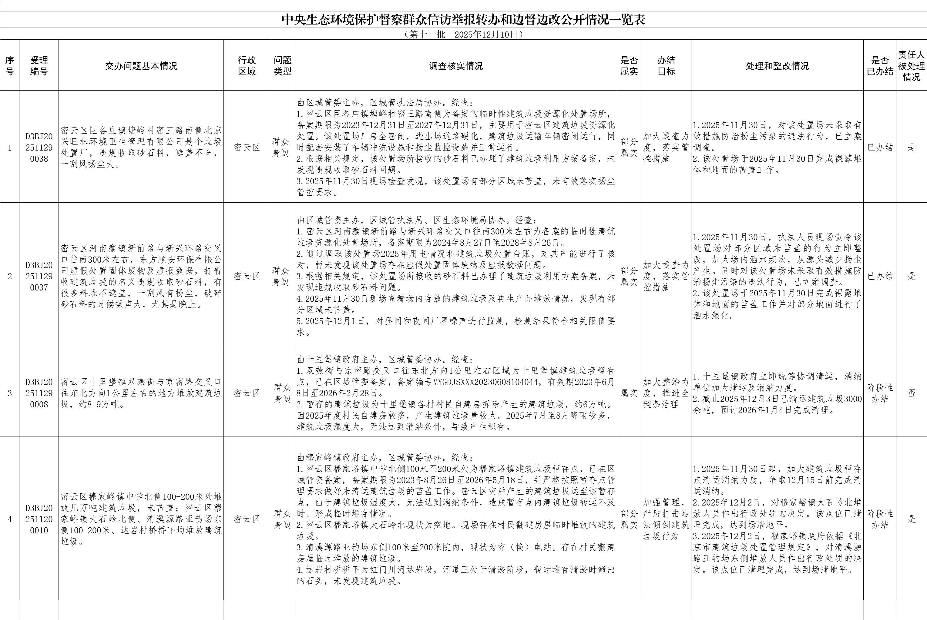 2025年11月30日,中央第一生态环境保护督察组向北京市交办第十一批群众信访举报件38件,涉及密云区4件。现按要求向社会公开本区该批次《中央生态环境保护督察群众信访举报转办和边督边改公开情况一览表》。(见下表)