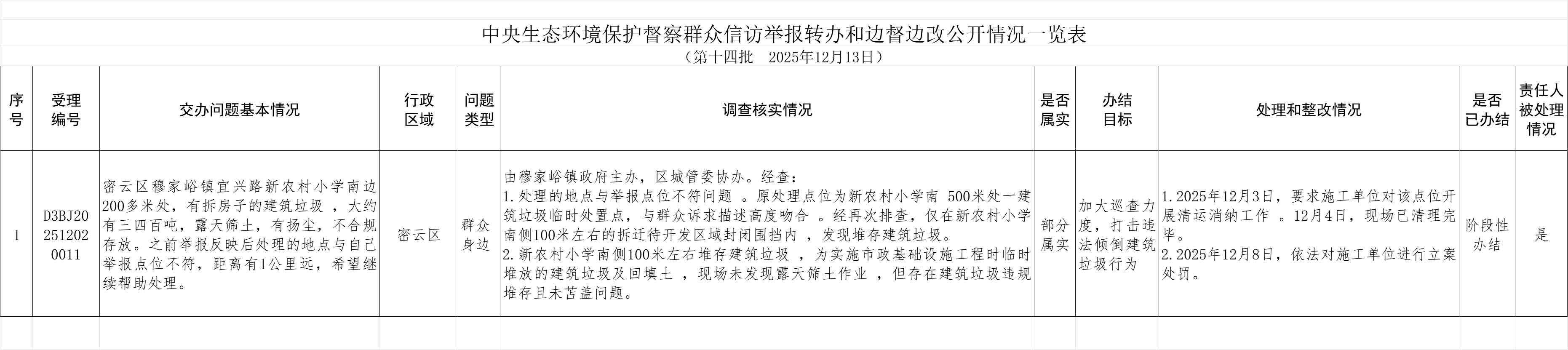 2025年12月3日,中央第一生态环境保护督察组向北京市交办第十四批群众信访举报件34件,涉及密云区1件。现按要求向社会公开本区该批次《中央生态环境保护督察群众信访举报转办和边督边改公开情况一览表》。(见下表)