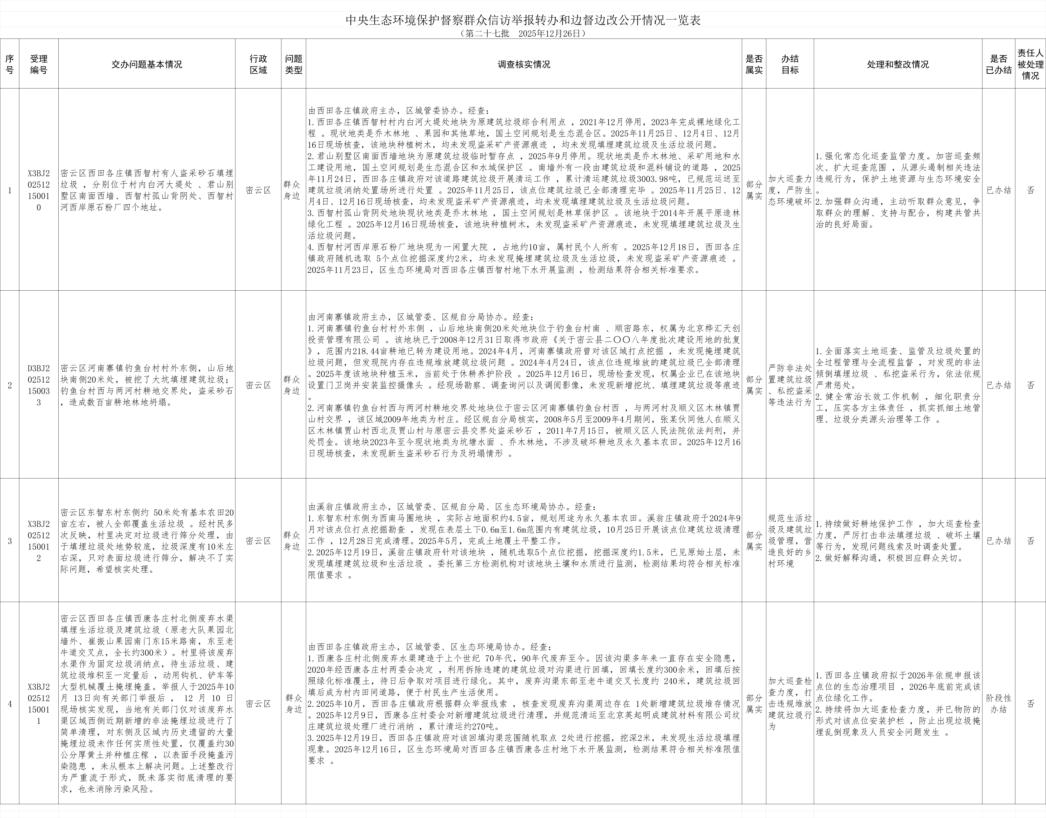 2025年12月16日,中央第一生态环境保护督察组向北京市交办第二十七批群众信访举报件33件,涉及密云区4件。现按要求向社会公开本区该批次《中央生态环境保护督察群众信访举报转办和边督边改公开情况一览表》。(见下表)