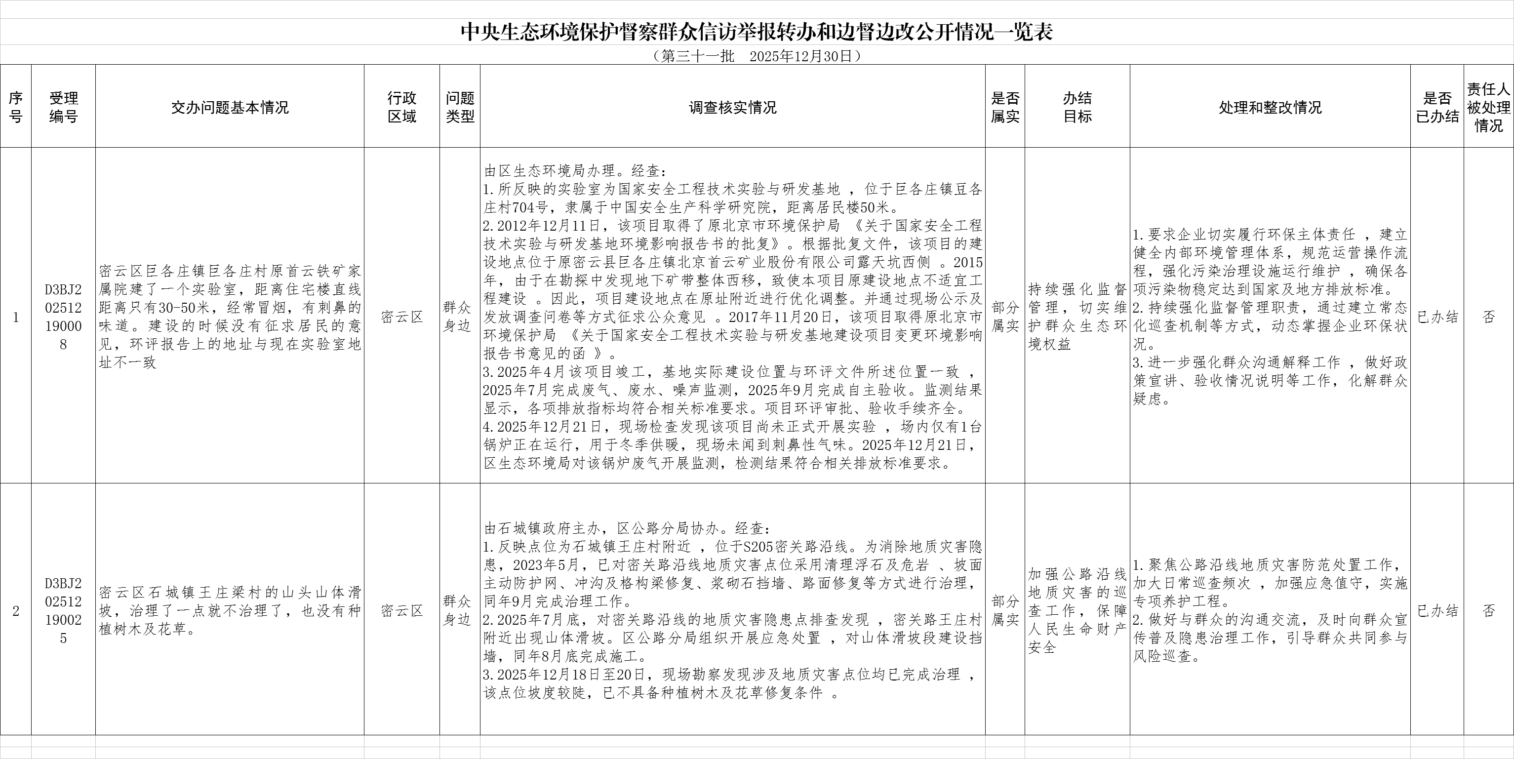 2025年12月20日,中央第一生态环境保护督察组向北京市交办第三十一批群众信访举报件33件,涉及密云区2件。现按要求向社会公开本区该批次《中央生态环境保护督察群众信访举报转办和边督边改公开情况一览表》。(见下表)