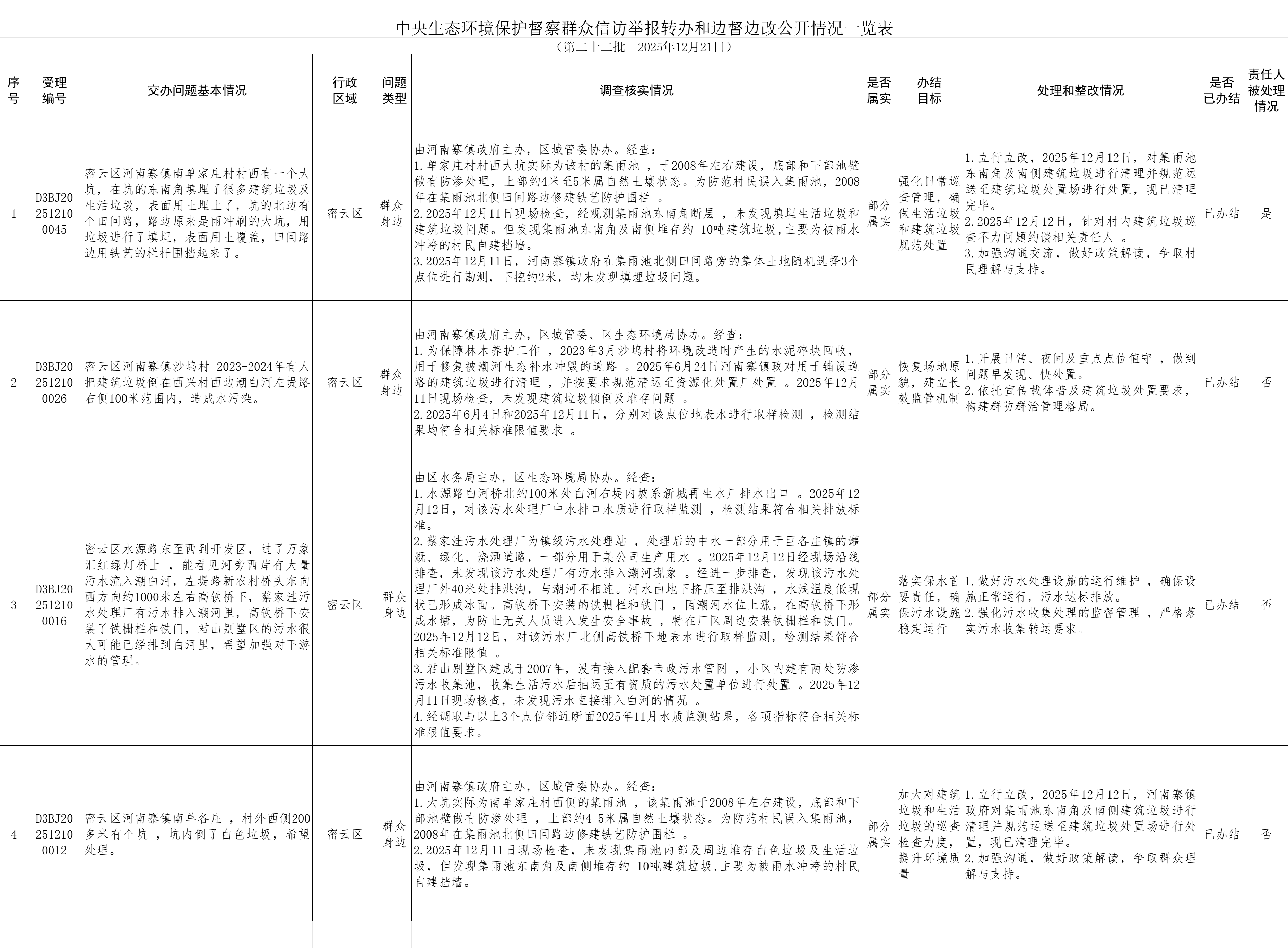 2025年12月11日,中央第一生态环境保护督察组向北京市交办第二十二批群众信访举报件36件,涉及密云区4件。现按要求向社会公开本区该批次《中央生态环境保护督察群众信访举报转办和边督边改公开情况一览表》。(见下表)