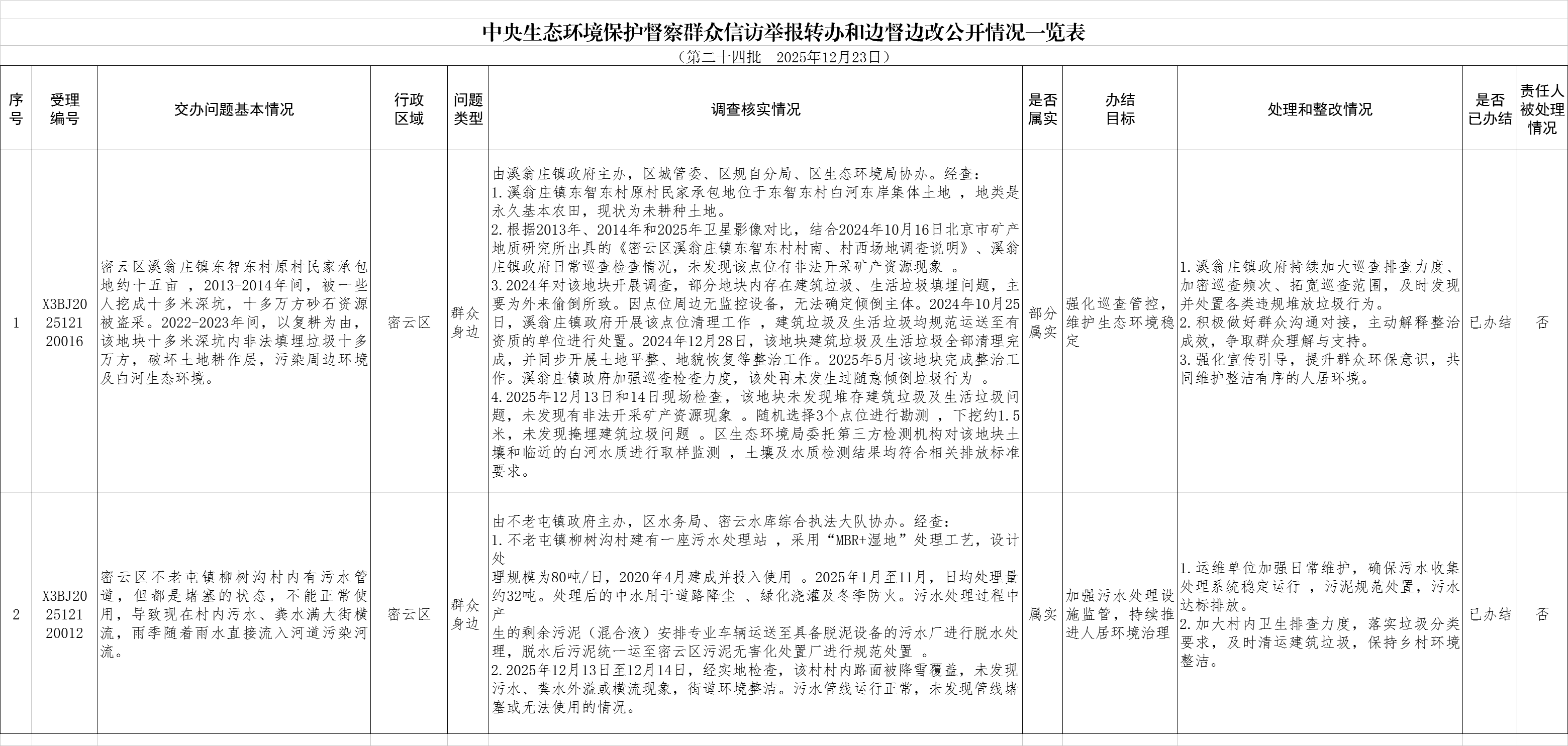 2025年12月13日,中央第一生态环境保护督察组向北京市交办第二十四批群众信访举报件34件,涉及密云区2件。现按要求向社会公开本区该批次《中央生态环境保护督察群众信访举报转办和边督边改公开情况一览表》。(见下表)