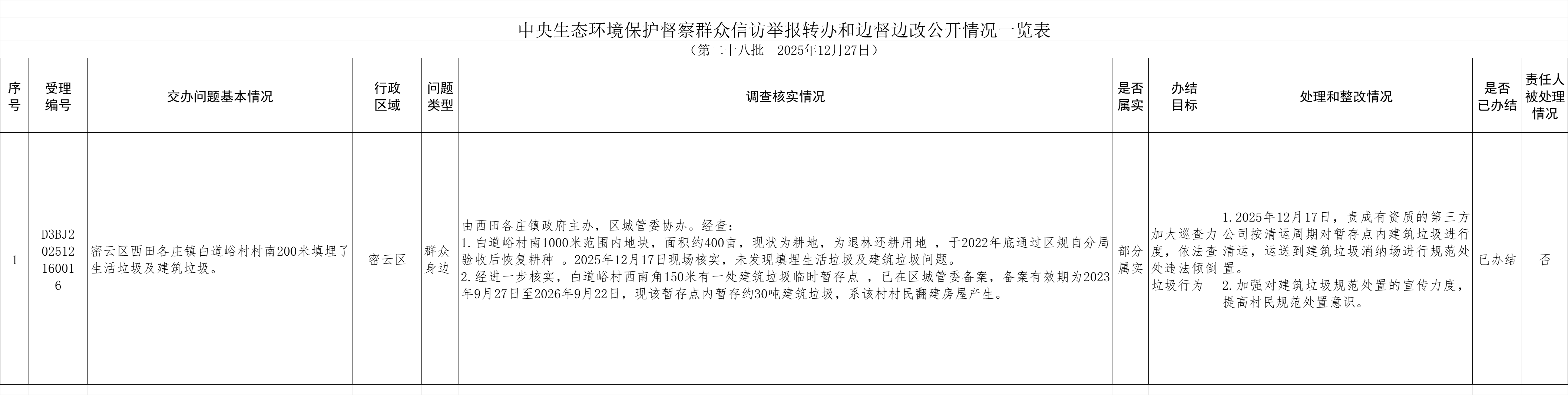 2025年12月17日,中央第一生态环境保护督察组向北京市交办第二十八批群众信访举报件33件,涉及密云区1件。现按要求向社会公开本区该批次《中央生态环境保护督察群众信访举报转办和边督边改公开情况一览表》。(见下表)