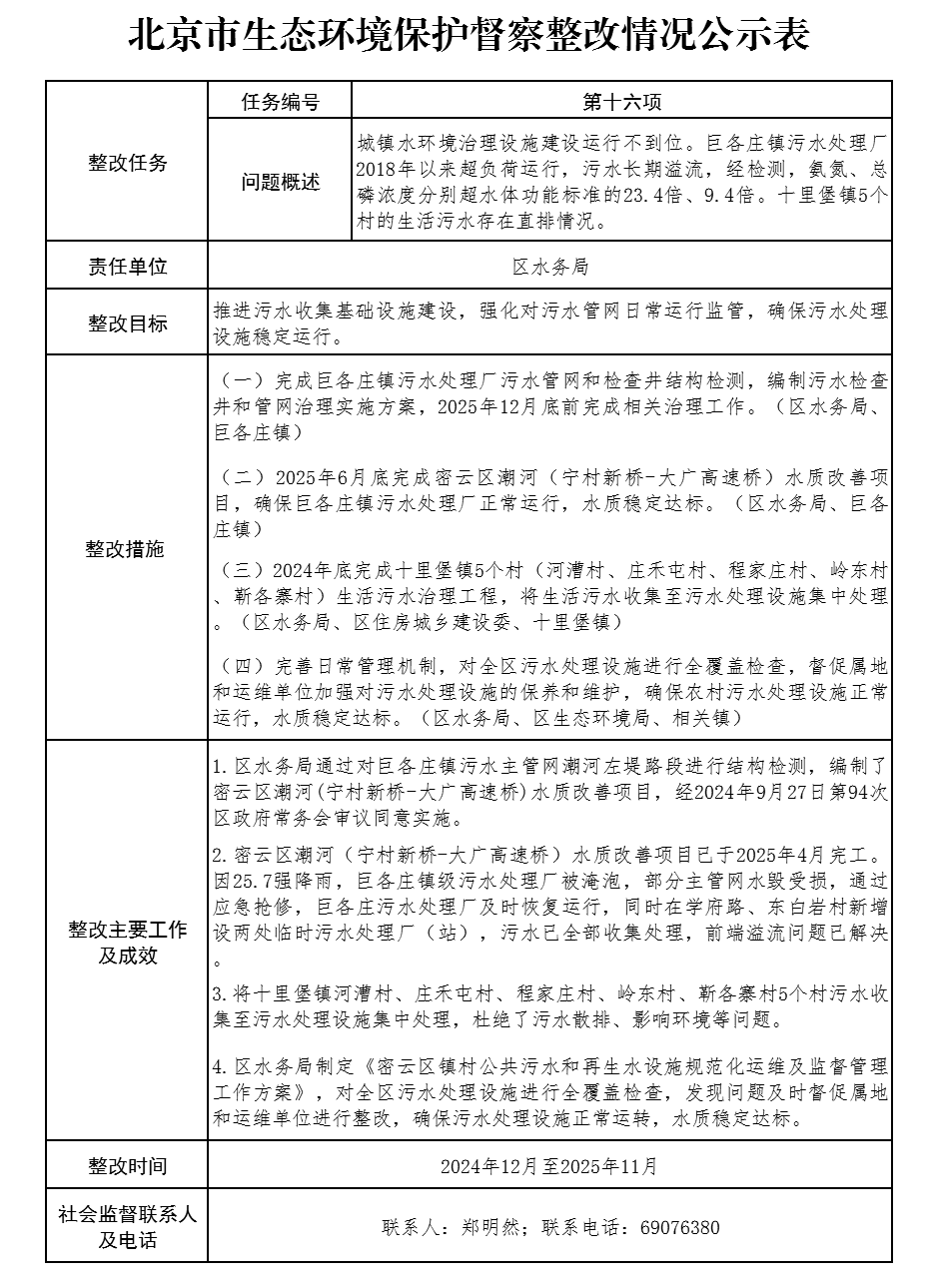 北京市生态环境保护督察整改情况公示表(第十六项整改问题)