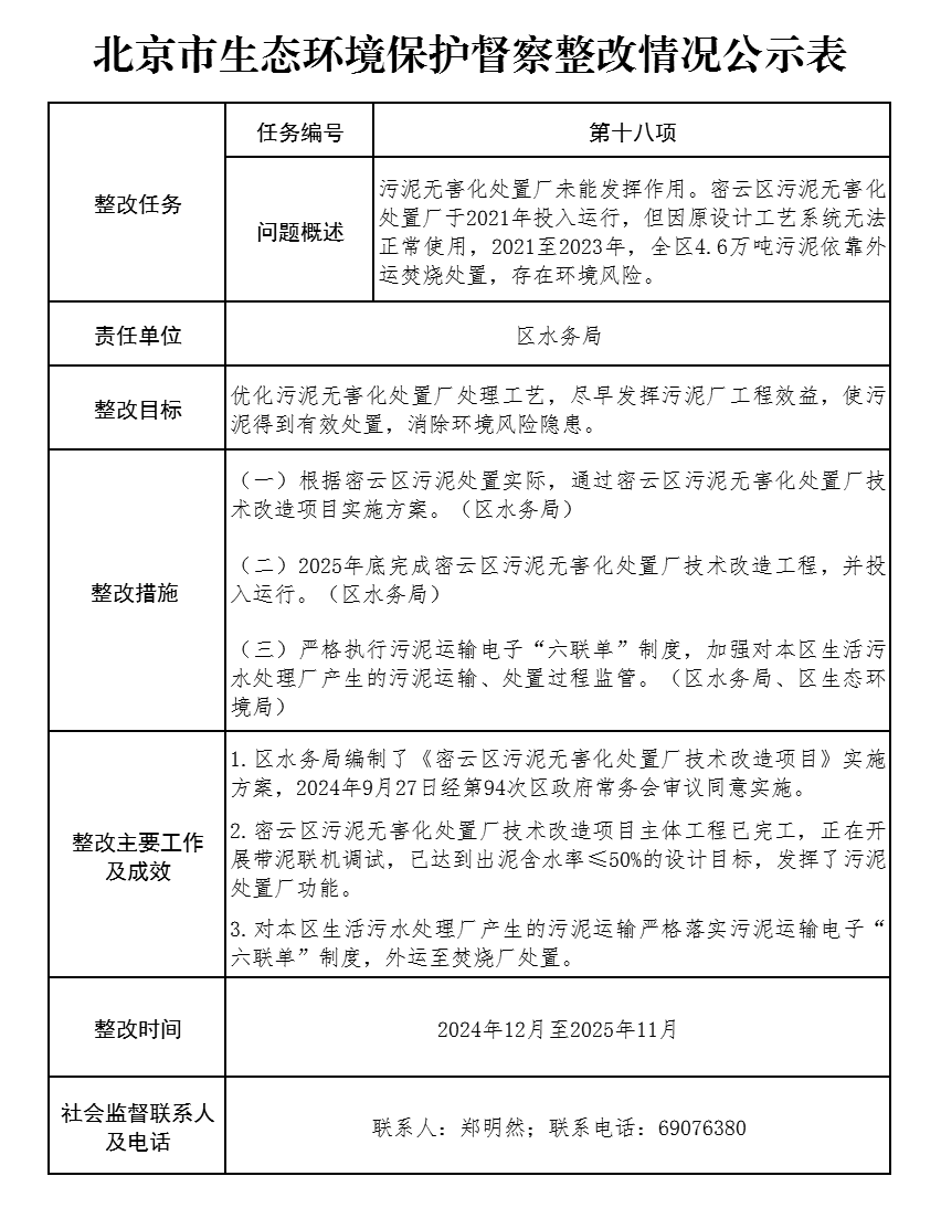 北京市生态环境保护督察整改情况公示表(第十八项整改问题)