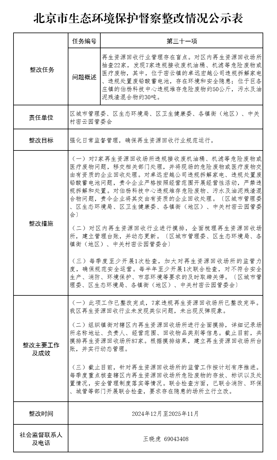 北京市生态环境保护督察整改情况公示表(第三十一项整改问题)