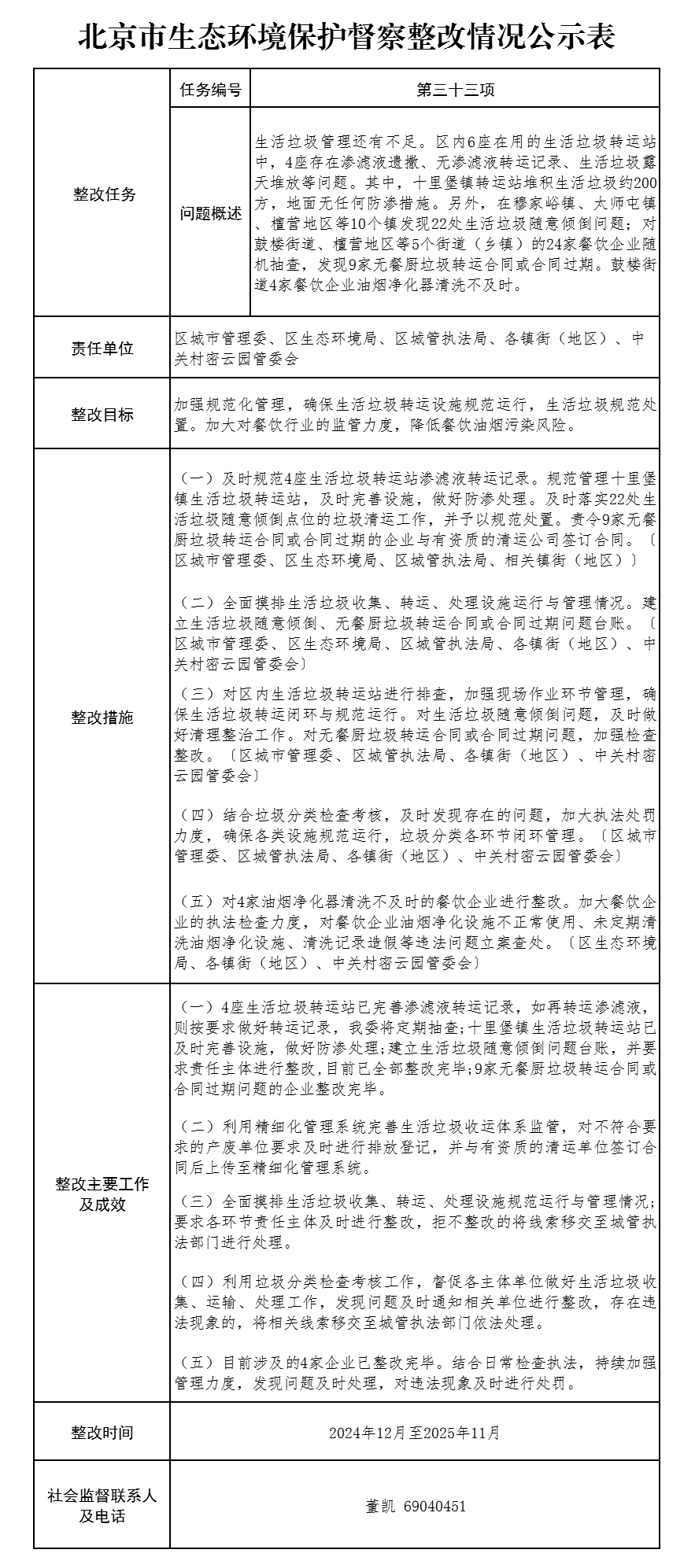 北京市生态环境保护督察整改情况公示表(第三十三项整改问题)