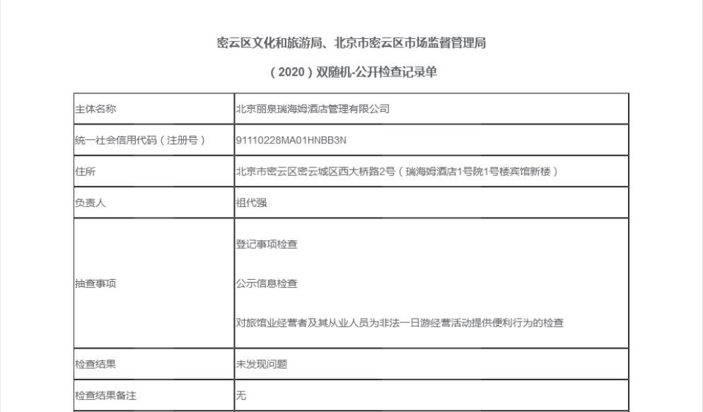 北京丽泉瑞海姆酒店管理有限公司检查结果公示