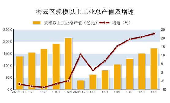 2025年1-8月,密云区完成规模以上工业总产值172.7亿元,同比增长22.7%。从重点行业看,汽车制造业完成产值70.9亿元,同比增长1.4倍;医药制造业完成产值28.6亿元,同比增长11.3%;酒、饮料和精制茶制造业完成产值21.5亿元,同比下降17.4%。