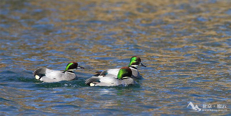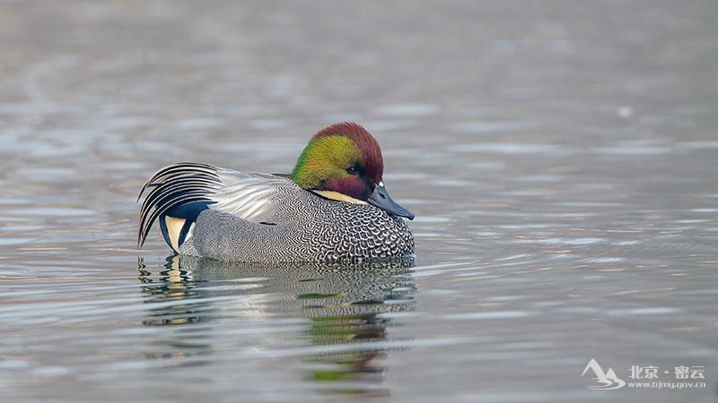 体型较大(46-54厘米)的鸭类。雄鸟头顶栗红色,头侧的绿色冠羽垂至颈侧,具金属光泽,非常闪亮。喉白色而具黑色环纹,胸部具细密的云纹。雌鸟以棕褐色为主,具“V”形黑纹。翼镜为墨绿色。喜结大群,停栖水上,常与其他物种混群,几乎不鸣叫。以水生植物的根茎和草籽等为主要食物。在我国繁殖于东北湖泊和湿地,冬季在华北至华南、西南地区越冬。在密云为常见旅鸟和冬候鸟。