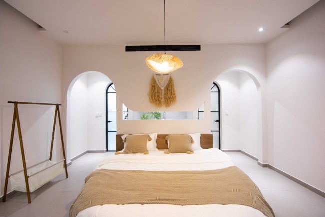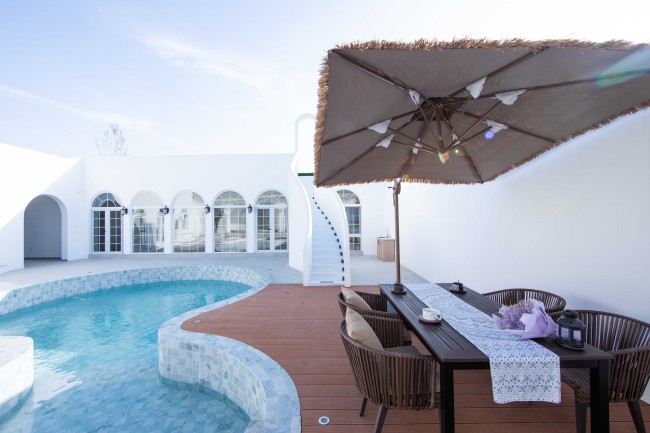 在这浪漫幽静的林间景色中,曼宿花间结合周边景色特点,与自然景观融合成一体,采用白色淡雅的色调,圆形拱形的建筑塑性,格子窗等浪漫元素设计,整体给人浪漫优雅,轻松舒适的感觉,让人置身在这美妙幽静的林间,舒适地享受慢下来的每一分时光。